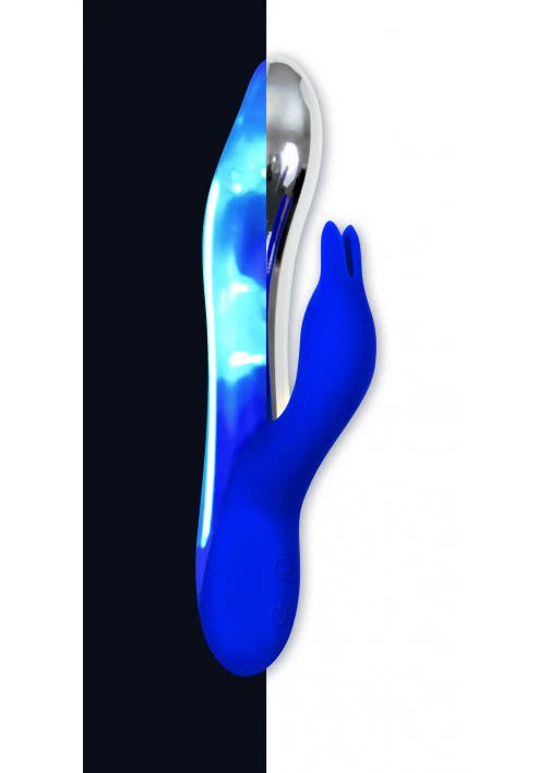 This spectacular light-up vibe adds a stunning glow to your orgasmic experience! When powered on, the metallic shaft lights up a beautiful blue, and the dual motors work their magic on two erogenous zones at once. Its shaft is gently curved for G-spot stimulation, and the firm yet flexible rabbit ears hop right up to the perfect spot to bring you right over the top! Clean up easily with your favorite Toy Cleaner and a warm water rinse.